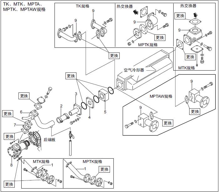 1.4 三菱S6R發動機空氣冷卻器用水泵、三菱S6R發動機恒溫器、水管的拆卸,檢修
