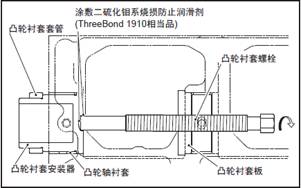 (4) 在三菱S6R柴油發(fā)動(dòng)機(jī)凸輪軸襯套螺栓的前端( 和三菱S6R柴油發(fā)動(dòng)機(jī)凸輪軸襯套安裝器的接觸部分) 涂敷二硫化鉬系耐高溫潤(rùn)滑劑( 類似于ThreeBond 1910)。