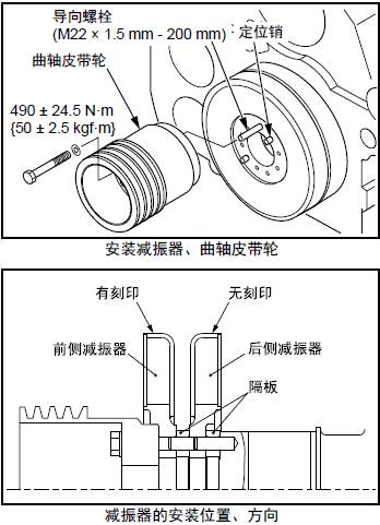 (2) 按照隔板、內側的三菱S12柴油發動機減振器、隔板、外側的三菱S12柴油發動機減振器、三菱S12柴油發動機曲軸皮帶輪的順序,通過導向螺栓,對準定位銷進行安裝。