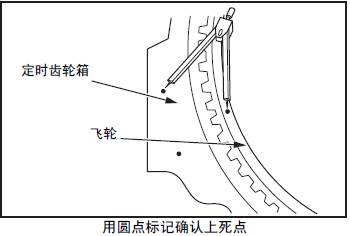 (3) No.1 三菱S12柴油發動機氣缸上死點的確認方法是,在三菱S12柴油發動機飛輪端面和三菱S12柴油發動機正時齒輪箱上打刻有圓點標記,當3 點之間的距離相同的時候,既是No.1 三菱S12柴油發動機氣缸的上死點。
