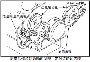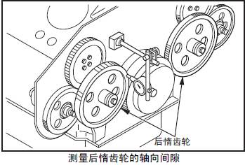 測量三菱S12柴油發動機風扇驅動器惰齒輪的軸向間隙。超過極限值時,確定故障部件后更換。