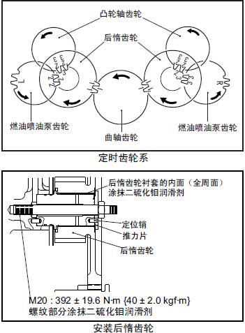 (1) 在三菱S12柴油發動機三菱S12柴油發動機后三菱S12柴油發動機惰齒輪軸三菱S12柴油發動機推力套筒上涂抹油脂,插入三菱S12柴油發動機缸體體內。這時,注意裝配記號"TOP" 要在最上方。另外,按照拆卸時作的識別記號安裝。
