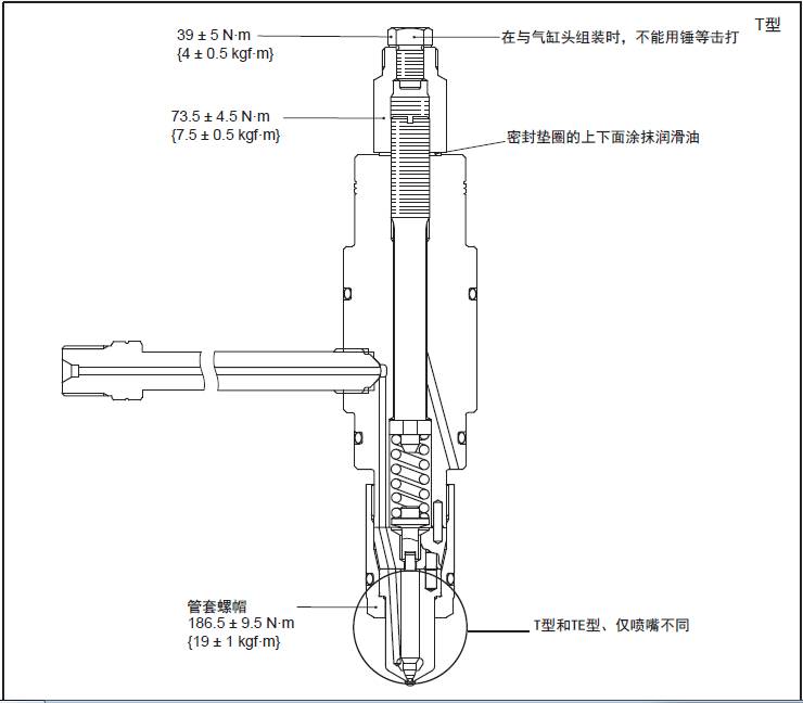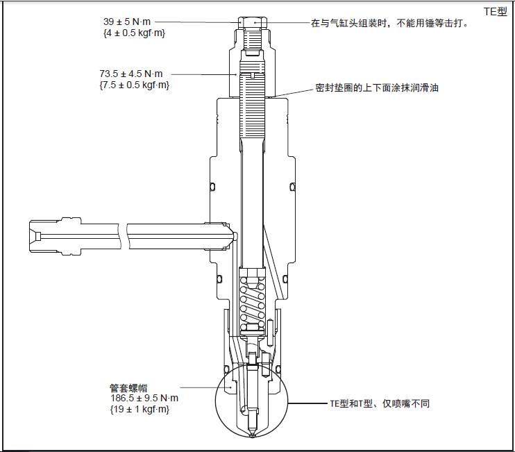 必須按照規定的扭矩緊固管套螺帽。旋緊過度時,會影響針閥的動作,引起排氣惡化或針閥卡死等故障。