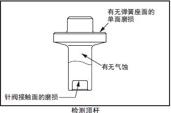 目測檢查頂桿,發現彈簧座單側磨損、針閥接觸面顯著磨損或下面錐部氣蝕時更換新的頂桿。