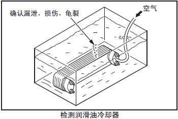 在冷卻器芯的潤滑油通道部位,進行1.5MPa{15 kgf/cm2} 的壓縮空氣測試,檢查芯部的損傷或龜裂。發現有漏泄時,更換新的冷卻器芯。