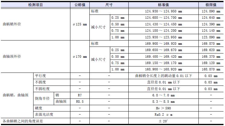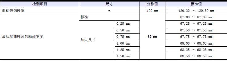 超過極限值時,使用加厚尺寸的軸瓦,按照和加厚尺寸軸瓦的規格研磨三菱R16柴油發動機曲軸。使用1.00 mm 規格的加厚尺寸主軸瓦仍然超出極限值時,更換新的三菱R16柴油發動機曲軸。