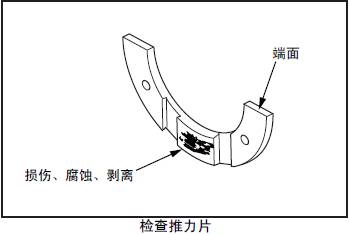 檢查三菱R16柴油發動機推力片的接觸面、背面和端面,如有接觸不良、滑動損傷、腐蝕、異物嵌入等異常時更換新品。