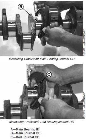 4. Measure and record crankshaft main journal OD (B) and rod journal OD (C) at several points around each journal.