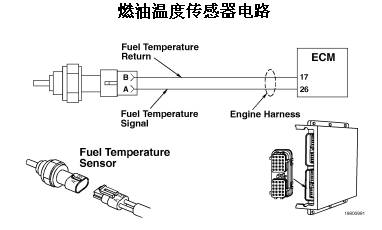 ECM 使用燃油溫度傳感器監(jiān)測燃油溫度。ECM 監(jiān)測觸針 26 上的電壓并將它轉(zhuǎn)換成溫度值。燃油溫度數(shù)值由 ECM 用于發(fā)動機保護系統(tǒng)。